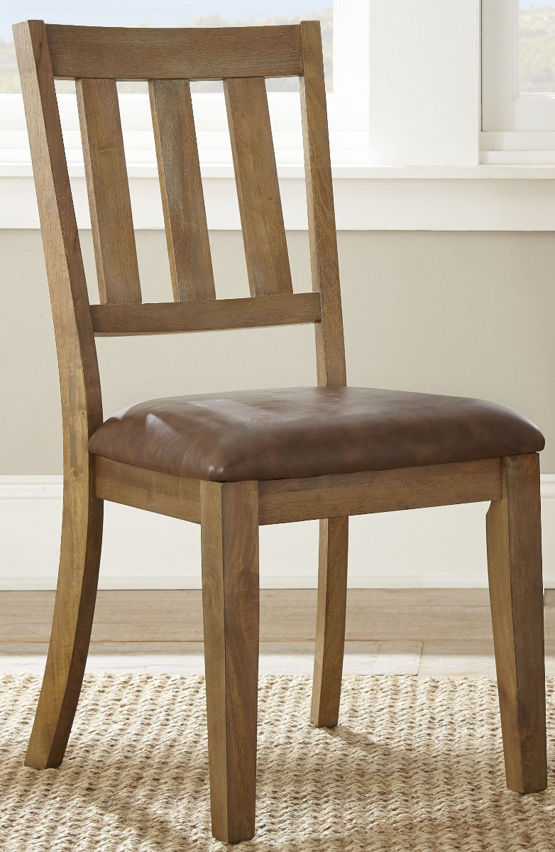 The classic schoolhouse design and washed pine finish of the Ander Side Chairs will add warmth and casual style to any dining space. The slightly curved, vertical slat back and padded brown faux leather seat ensure your comfort. Tapered front legs and flared back legs feature floor glides to help protect your floors from damage.
