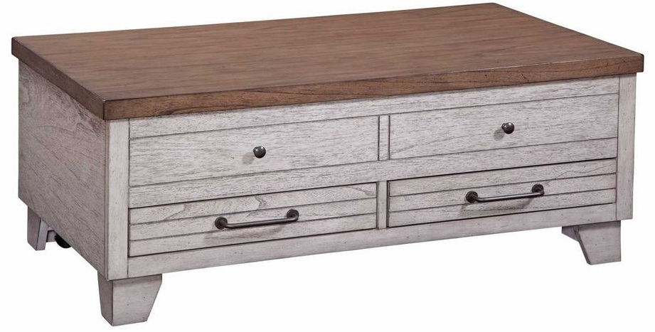 Add some function to your living room with the Lift-Top Cocktail Set from Bear Creek! Perfect for your farmhouse-inspired home, the Bear Creek Lift-Top Cocktail Table adds needed functionality to your life by giving you a work surface right on your sofa. Just lift-up the top of the Bear Creek and work or eat right from your sofa. The casual two-tone combination of white and honey smoke finish works well with any casual upholstery setting and features distressing that make the tables look like a vintage heirloom in any room.