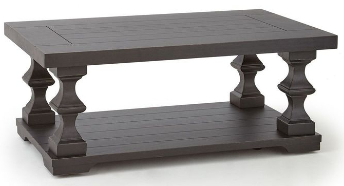 A new take on classic farmhouse styling, the Dory occasional collection looks like it was plucked out of an English pub. The neutral ebony finish and plank top will blend well with any casual decor whether rustic or cottage styling. Beefy tops and sculpted posts combine with a large scale to give the collection a very substantial feel.
