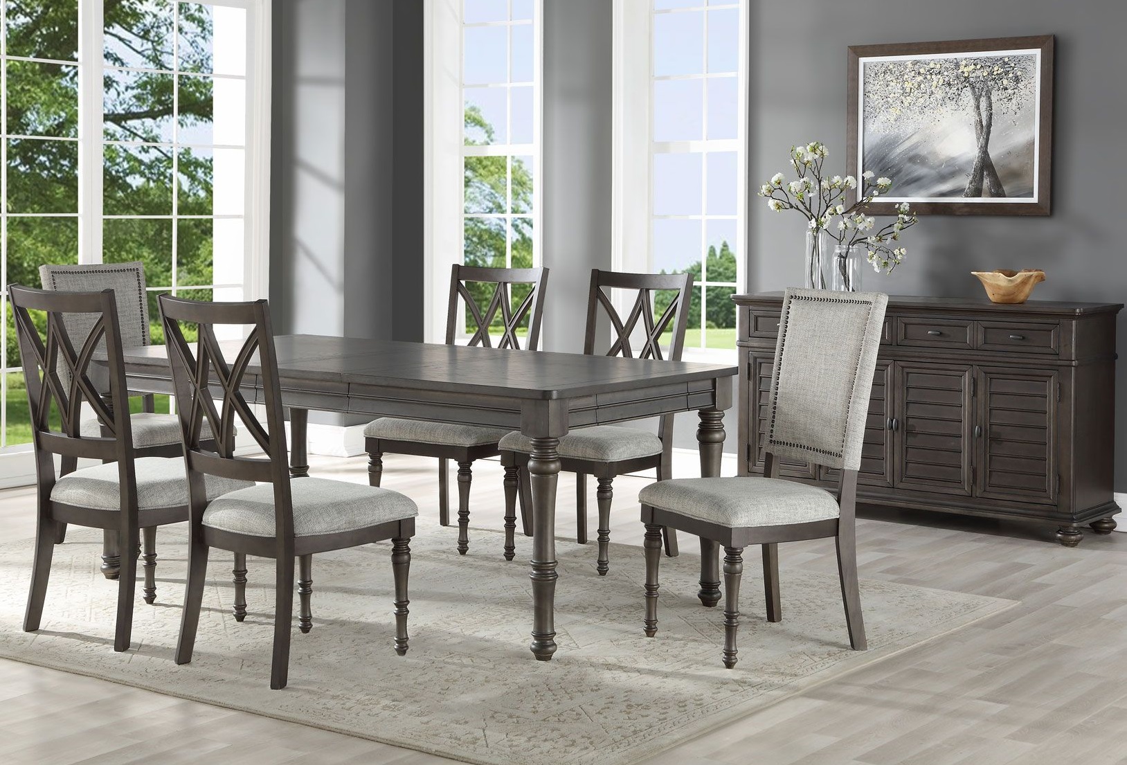 Updated traditional styling details include nail-head upholstered chairs and web back wooden side chairs, turned table and chair legs and shuttered doors on Server