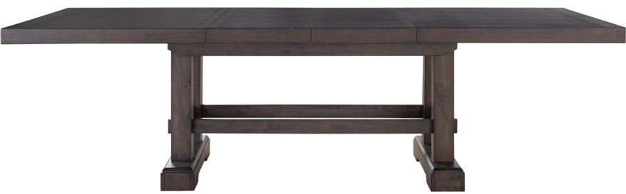 The twin pedestal table features details like exposed tenons to give a rustic feel that works well with casual environments.