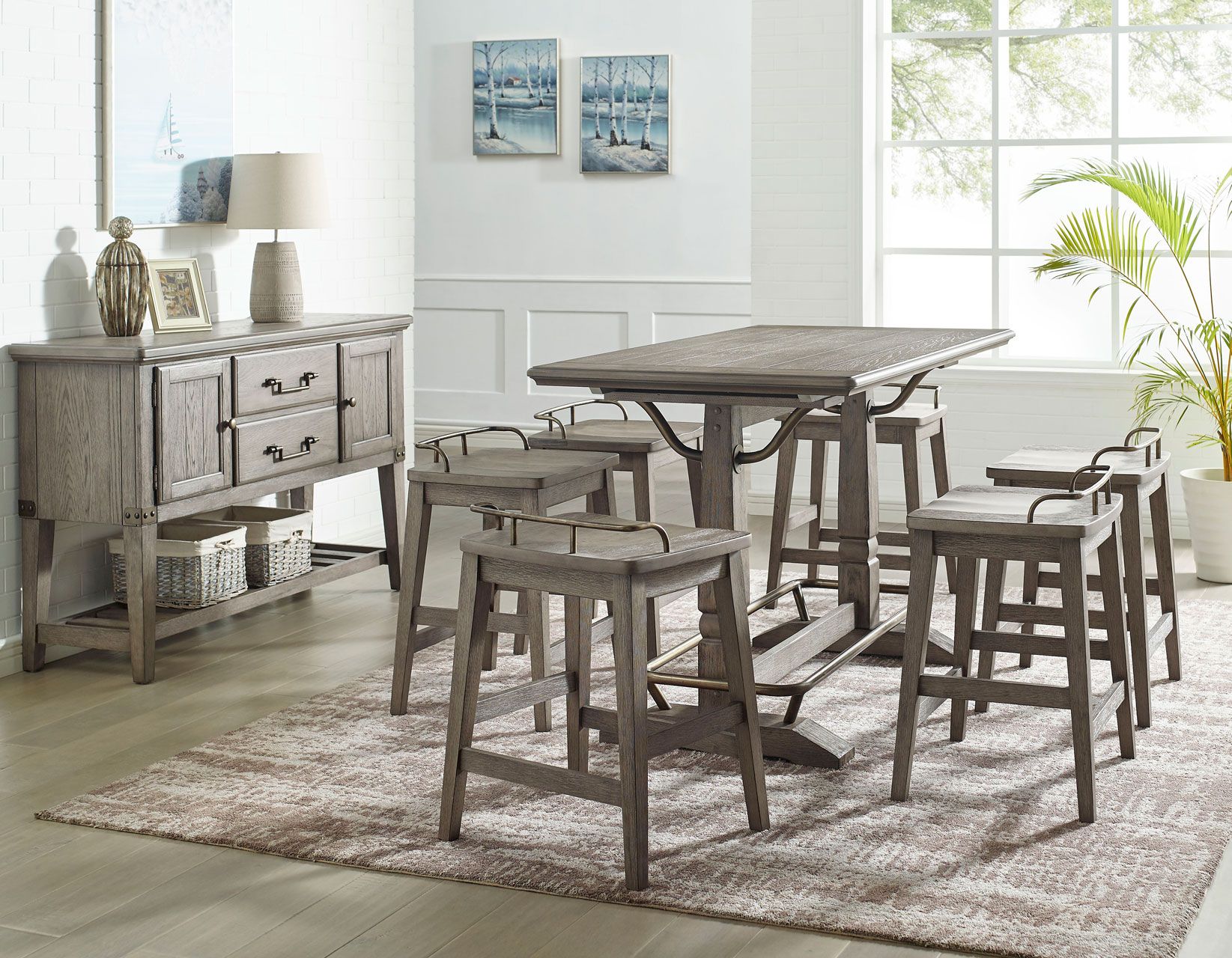Includes one 59.5-inch Gathering Table and six Counter Stools.