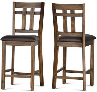 These Saranac Counter Chairs are great to use with the Saranac 5-Pack Dining Set or to use on their own at a counter or bar. Rustic styling in a mocha-finish, these Counter Height chairs look beautiful with the solid wood table Saranac table that features plank construction and a timber-beam platform base. The primitive, heirloom feel of the group works even better when you add these additional chairs. the Arts and craft influenced design pairs with easy-care polyurethane upholstered seats for a great care-free look.