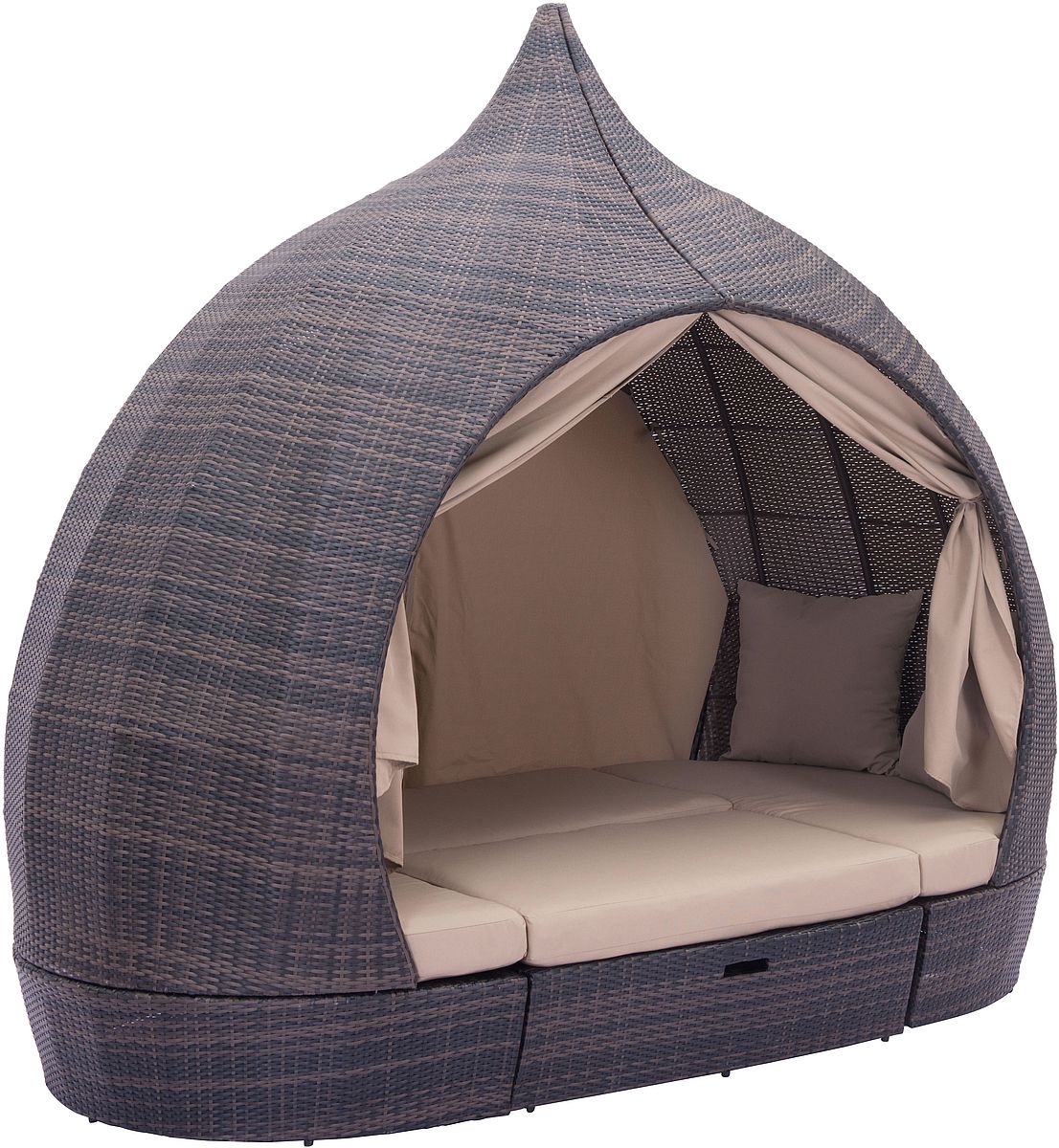 This bed unit has privacy curtains, side tables, and additional ottoman seating for a true beach club atmosphere for any space.